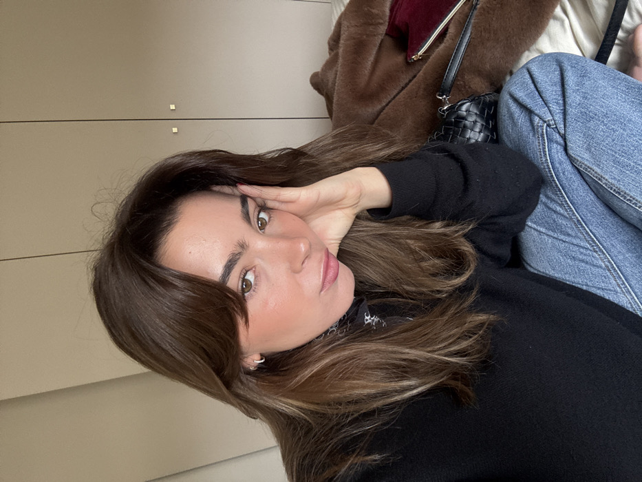 A young adult female is depicted in a medium close-up shot within an indoor setting in the city of Porto, Portugal. She has long brown hair with a fringe and brown eyes, and is wearing a black long-sleeved top and light blue denim jeans. Small hoop earrings are visible in her ears. Her left hand rests against the left side of her face, and she maintains direct eye contact with the camera, exhibiting a neutral expression. To her right, on a light-colored, textured surface resembling a bed, a brown faux fur-like blanket is visible, alongside a small black woven handbag with a strap and a partially obscured dark red clutch. The background consists of light-toned, possibly beige or light grey, wardrobe panels featuring small, square, gold-colored handles.