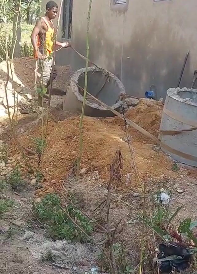 A man stands between the camera and the side of a building, pulling a strap attached to a concrete well liner. Two well liners are visible on the property. The man wears an orange tank top and pants. The building is a pale color with three windows. A shovel lies behind the well liner on the right.