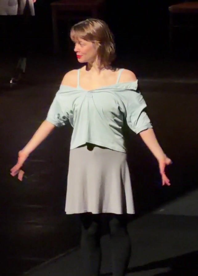 woman on a stage. She is fair-skinned with shoulder-length blonde hair, red lipstick, and is wearing a light blue off-the-shoulder shirt, a gray skirt, black leggings, and brown shoes with white socks. She begins with her arms down, then slowly raises them to place her hands on her shoulders. In the background, there are wooden chairs and at least one other person who is only partially visible. The stage is dark. A rhythmic percussive musical score plays throughout.