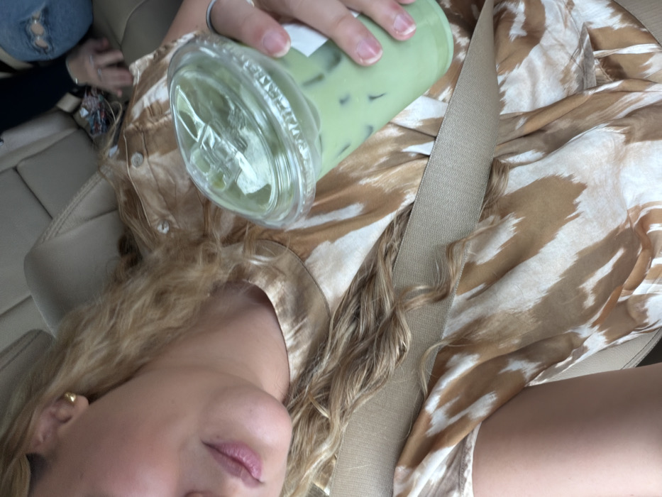 The scene is set inside a vehicle within Key Biscayne, United States of America. A light-skinned individual with long, wavy blonde hair and a gold stud earring in their left ear occupies the foreground, visible from the mid-chest upward. They are wearing a light brown and white patterned top or dress, secured by a light beige seatbelt across their torso. Their right hand holds a clear plastic cup filled with a light green iced beverage, likely matcha, displaying a partial white label. In the upper right background, a second individual is partially visible, showing a hand with a silver ring on the index finger, part of a blue ripped jean leg, and dark clothing, indicating an additional passenger. The vehicle's interior features light tan upholstery. No external environment is discernible.