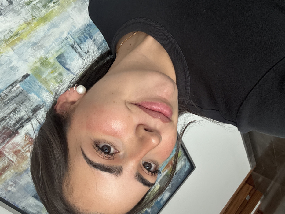 A woman's face is angled towards the viewer. She has dark hair, arched eyebrows, and long eyelashes. Her skin is fair with a rosy tint. A pearl earring adorns her left ear. She wears a black top and a thin gold necklace. A painting hangs on the wall behind her, featuring abstract brushstrokes of blue, white, and yellow. A glimpse of furniture and a picture frame is also visible in the background.