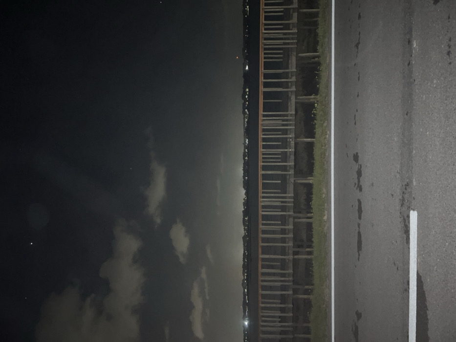 A night landscape shows a dark sky with scattered clouds. A body of water reflects the faint city lights on the horizon. A structure, possibly a pier or boardwalk, extends along the water's edge. A paved road runs parallel to the structure, marked with a white line. The overall scene is dark and slightly indistinct, typical of a night photograph.
