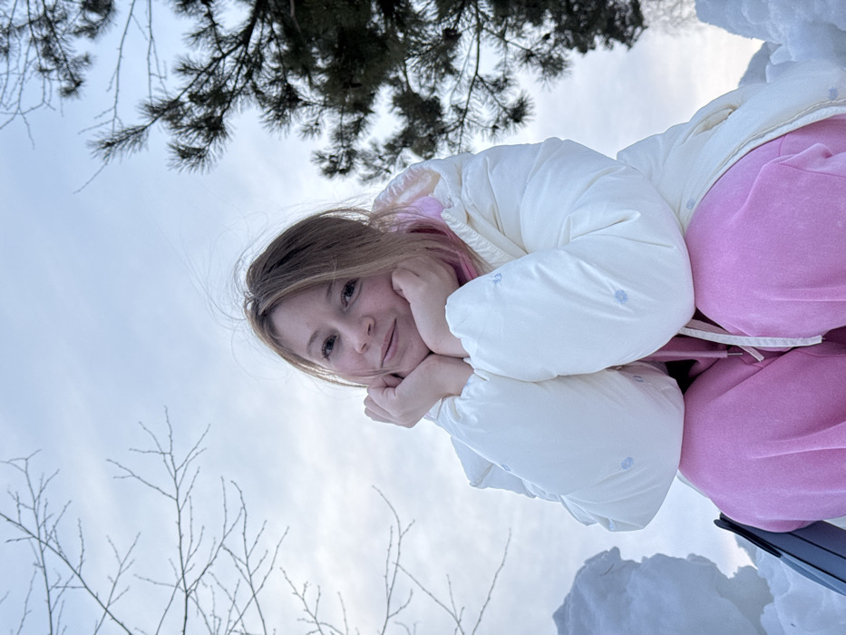 An image taken in Mishkino, Russia, depicts a young adult female seated outdoors in a snowy environment, captured from a low-angle perspective