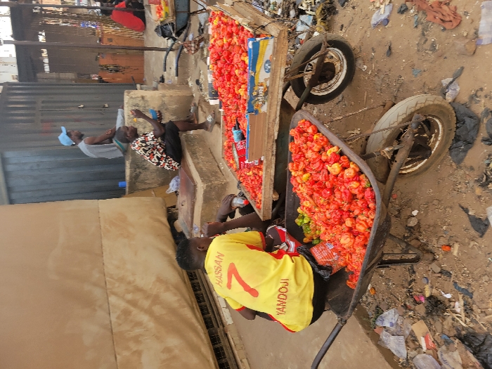 A vibrant street scene features two carts laden with red peppers, likely for sale. One cart is a traditional handcart, brimming with peppers, while the other is a wheelbarrow similarly full. A man in a yellow shirt with the name "HASSAN YANDOJI" sits beside the wheelbarrow. In the background, two people are seated on a concrete structure, engaged in an activity. The surrounding ground displays signs of a bustling market environment, with scattered debris and trash.
