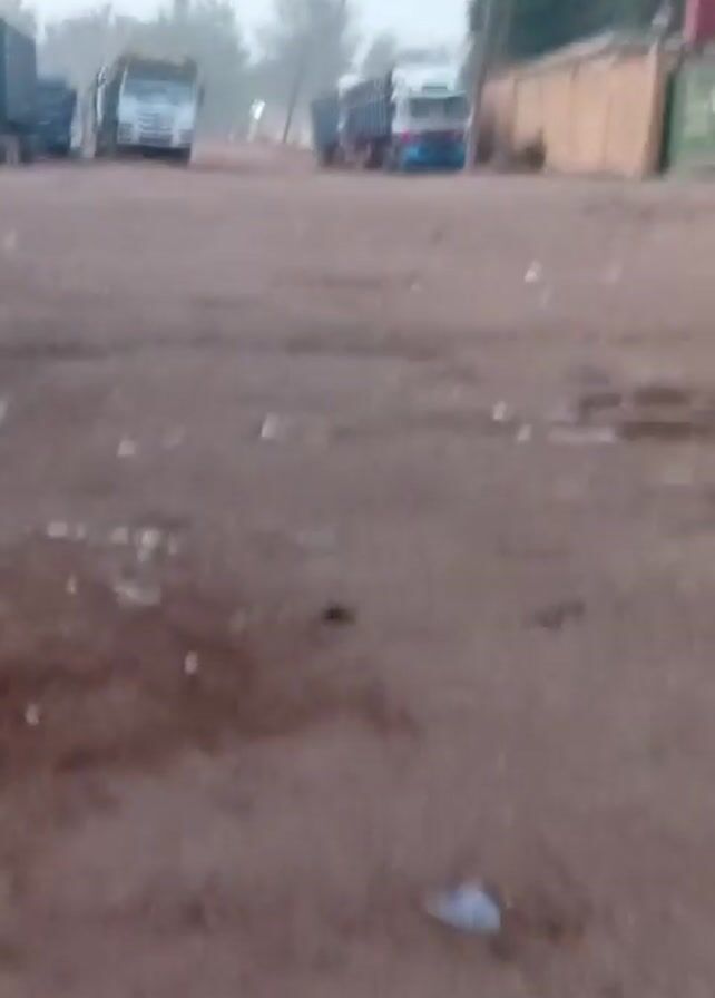 The camera is held at ground level, pointing towards a dusty, reddish-brown, dirt road with scattered litter. In the background, several large trucks are parked on the side of the road, obscured by a hazy or foggy atmosphere. A low wall runs along the right side of the frame, with glimpses of a building behind it. A person’s legs briefly come into view in the foreground. The camera is shaky.