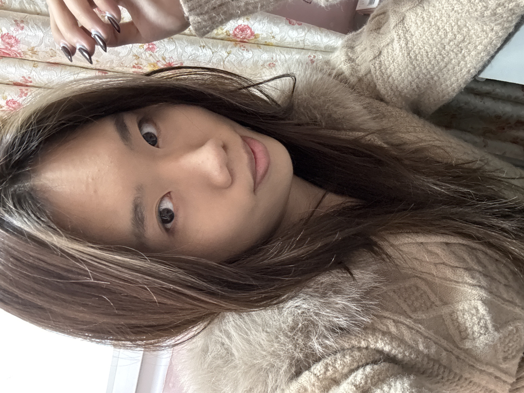 A person with long brown hair and light skin is close to the camera. They are wearing a beige sweater with a furry trim. In the upper left corner of the image is a hand with long, dark nails with a silver crescent moon design. The background is a floral-patterned surface. The location of the image is the Shapingba District, China.