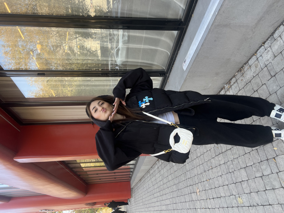 The image captures a young adult female posing on a paved sidewalk in Yerevan, Armenia, specifically near the Cafesjian Center for the Arts at the Yerevan Cascade. She stands facing forward, with her head tilted, lips pursed in a pout, and both hands raised to either side of her face, fingers splayed. Her long, dark brown hair frames her face. She wears a black hooded puffer jacket, unzipped to reveal a white crop top, paired with black loose-fitting sweatpants and white sneakers with black accents. A small, white, ruched handbag with gold hardware, bearing the "Miu Miu" logo, is worn cross-body over her left hip. Two stylized cross-shaped pins, one light blue and one white, are attached to the upper left chest of her jacket. The background to her left features a distinctive reddish-orange, textured architectural facade with vertical windows, consistent with the Cafesjian Center for the Arts. To her right, large, dark-framed windows reflect an urban environment, including trees with yellow-orange autumn foliage, a blue sky, and a white car in the distance. The sidewalk is constructed from light grey rectangular pavers. In the far left background, two indistinct male figures are visible walking away from the camera. The scene is illuminated by bright natural sunlight, indicative of a clear day.