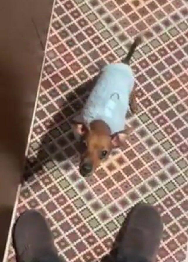 A person standing on a patterned rug films a small brown dog wearing a fuzzy blue sweater