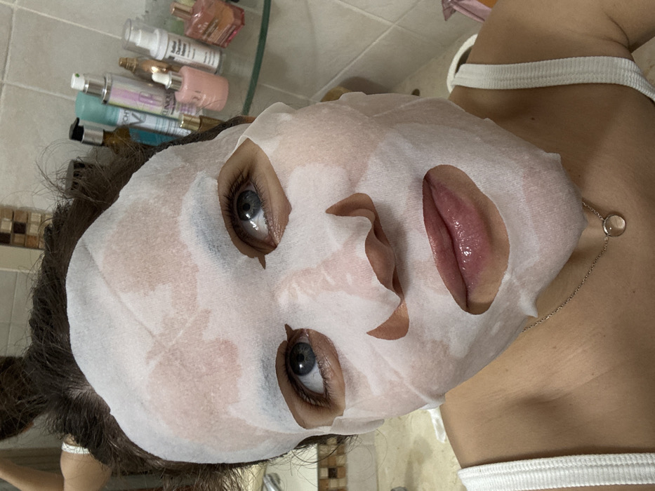 A close-up photograph depicts an individual with a white sheet face mask applied to their face