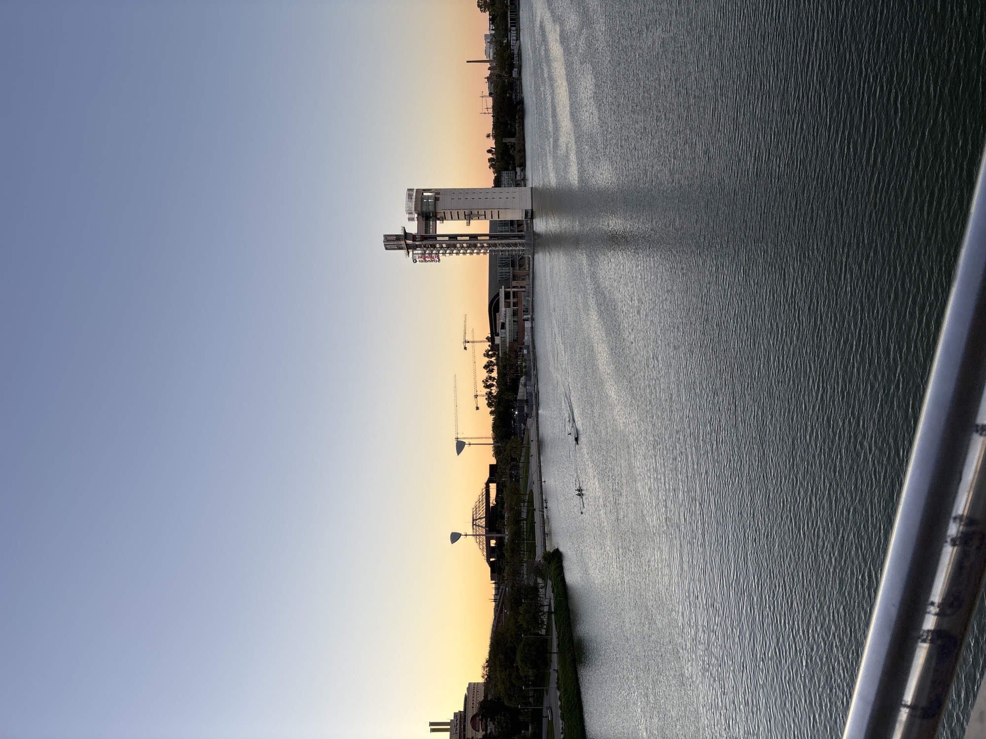 The image depicts a twilight scene along the Guadalquivir River in Seville, Spain, looking towards the Isla de la Cartuja. The sky transitions from a clear, pale blue overhead to a bright orange-yellow gradient at the horizon. In the immediate foreground, a metallic handrail runs horizontally across the bottom of the frame. The river occupies the majority of the lower half of the image, displaying a dark, rippled surface reflecting the sky and distant structures. Two narrow rowing sculls, each with two occupants, are visible on the water in the midground, moving from left to right. A small motorboat follows the second scull, producing a wake. The left bank of the river features a treeline with streetlights along a paved promenade. Beyond the trees, a multi-story building with prominent chimneys is visible on the far left. Towards the center-left background, a large building with a distinctive domed or angular glass roof structure is present. Multiple construction cranes are silhouetted against the horizon further in the background. Dominating the right side of the scene and situated partly in the river, the Pabellón de la Navegación (also known as the Torre Sevilla observation tower) stands as a tall, white vertical structure. It features visible external staircases, platforms, and some red lettering on its upper section. The tower casts a dark reflection in the river's surface. Distant buildings and trees are visible along the right bank.