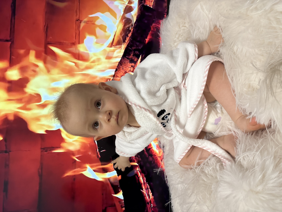 A baby in a white robe with pink trim lies on a fluffy white rug. The robe features a panda face on the lapel. The baby wears a diaper. Behind the baby is a digital background depicting a roaring fireplace with logs and flames. The image is rotated counter-clockwise, making the baby appear sideways. The baby looks directly at the camera with a curious expression.