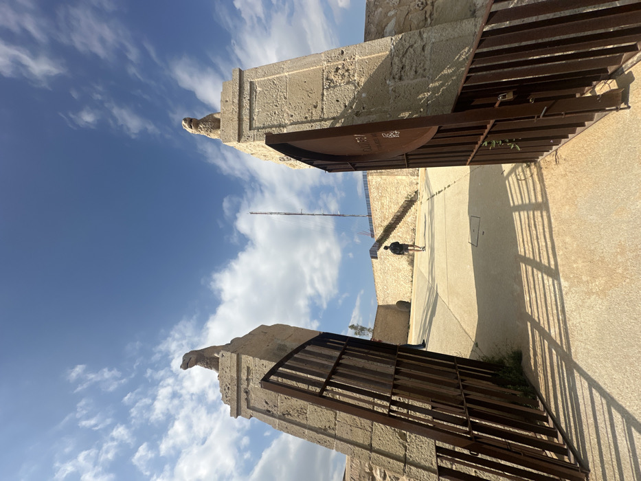 This image depicts an exterior view of an entrance within the Santa Bárbara Castle (Castillo de Santa Bárbara) in Alicante, Spain. The scene is dominated by two large, open, weathered dark brown metal gates positioned in the foreground, framing a light-colored paved pathway. Each gate is attached to a substantial light-colored stone pillar. Topping each pillar is a stone statue resembling a recumbent lion or sphinx, facing outward from the entrance. The gate on the right features a circular metal sign, partially obscured, which reads "ALICANTE" and "MUSEU," indicating the Museum of Alicante located within the castle. Long, parallel shadows from the gate bars stretch across the sunlit pathway. One individual, a male, is walking away from the camera in the midground, moving along the pathway toward a set of stone stairs on the right. He is dressed in a dark top and light shorts. Another person's legs are partially visible behind the left gate pillar. The pathway leads to a fortified stone wall, with a metal railing running along its top and bordering the ascending stairs. In the background, a tall, slender lattice mast or antenna stands prominently against a clear blue sky scattered with white clouds. The overall environment suggests a historical fortification on a sunny day.