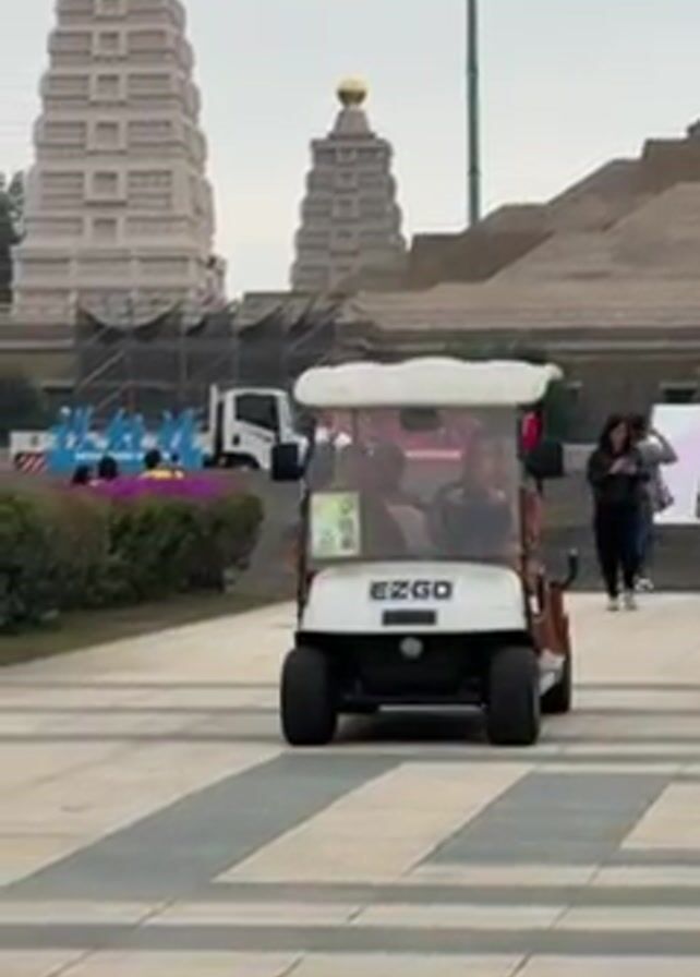 white EZGO golf cart with four people, seemingly monks in brown robes, driving on a paved walkway. In the background, there are tall, multi-tiered pagoda-like structures. Other people are walking on the walkway, some looking at their phones. There's some greenery and what appears to be a sign or display partially visible in the background. A white truck is parked behind the greenery and to the left.