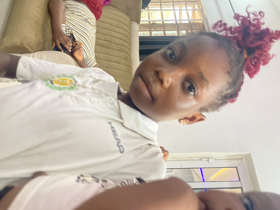 An indoor scene features three individuals. In the foreground, a young Black female with dark skin and reddish-maroon hair extensions styled in an updo directly faces the camera. She wears a white polo shirt with the text "HEAD" on the right chest and a necklace featuring a circular emblem pendant. Gold-colored flower-shaped earrings are visible on her earlobes. To her immediate right, a partial view of another individual's face, including a portion of an eye and cheek, is present, extremely close to the camera. In the mid-ground to the left, an adult-sized individual reclines on a light brown fabric sofa, wearing a horizontally striped shirt and holding a dark-colored smartphone or remote control. The background includes a window with horizontal bars on the left and a white doorframe with a visible blue/purple light strip on the right. The setting appears to be a domestic living space. The specific location within Idah, Nigeria, is not discernible from the visual evidence.