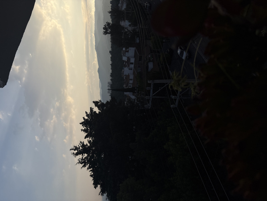 A landscape view features mountains in the distance, obscured by a light haze. A cluster of buildings is nestled in a clearing among trees, with visible power lines running overhead. The left side of the image is dominated by a bright, cloudy sky, while the foreground on the right is shadowed by foliage, creating a stark contrast. A dark structure is vaguely seen on the upper left corner of the image.