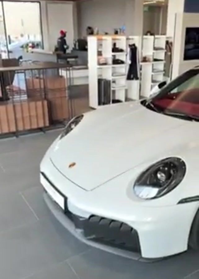 The video starts with a top-down view of someone standing on grey tile flooring, wearing light pink and white sneakers. The camera then pans up to reveal the interior of a car dealership, specifically a Porsche dealership. A white Porsche with a red interior is prominently displayed. There are other vehicles and information kiosks in the background. The camera briefly focuses on the Porsche before returning to the view of the person's feet on the grey tile floor.