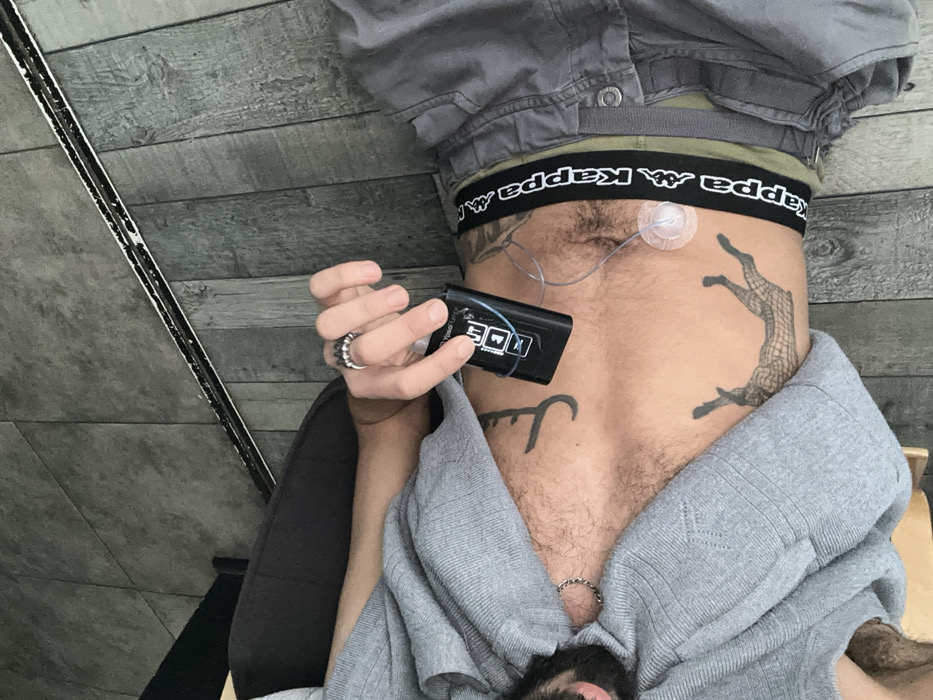 The image, taken in Marcoussis, France, depicts an individual reclining or lying down, viewed from a top-down perspective in an indoor setting. The subject, a male with a beard, is wearing a grey ribbed long-sleeved top and grey cargo trousers, with a "Kappa" branded underwear waistband visible above the pants. Tattoos are present on the abdomen: a dark, stylized antler or tree-like design on the upper abdomen and a net-patterned outline of an animal on the lower right abdomen. Body hair covers the chest and abdomen. A spiked silver-colored ring is worn on the right ring finger, and a silver-colored chain bracelet is on the left wrist. The subject holds a black Ypsomed Europe insulin pump in their right hand, which displays "500" and "OK" on its screen. A clear tube connects the pump to a circular, transparent infusion set attached to the right side of the abdomen. The environment features grey, distressed wood-patterned flooring and a dark upholstered furniture item partially visible on the left.