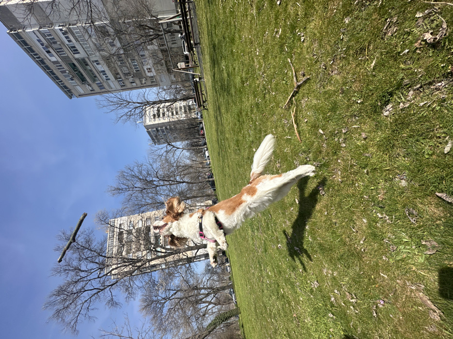 - "A white and reddish-brown medium-sized dog, wearing a pink harness, is captured mid-leap in a park within the city of Plovdiv, Bulgaria" by FM-N7GRt1, licensed under CC BY 4.0