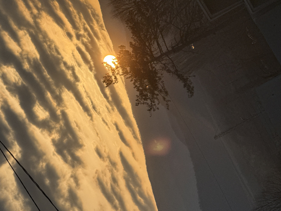 A landscape is depicted in the vicinity of Kresna, Bulgaria, during a sunrise or sunset event. The sky features an orange-yellow hue with parallel, elongated dark grey clouds extending diagonally across the frame. The sun, a bright yellow-white orb, is positioned in the upper right quadrant, partially obscured by the upper branches of a silhouetted coniferous tree. A lens flare artifact is present to the left of the sun. Multiple dark mountain ranges are visible, receding into an atmospheric haze. Two electrical power lines diagonally cross the upper left quadrant. A utility pole is indistinctly visible in the mid-ground haze. A dark, rectilinear architectural feature is visible in the lower right foreground. No human subjects or active interactions are present.
