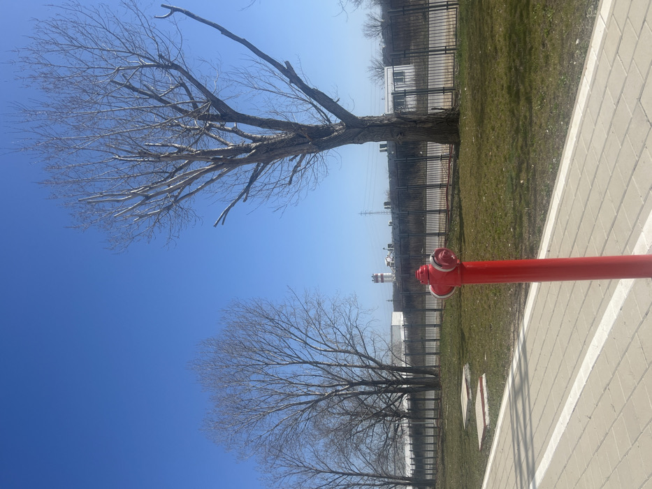 The scene depicts an outdoor urban-industrial landscape under a clear, cloudless blue sky, likely in the vicinity of the Sofia Thermal Power Plant (TEC Sofia) in Sofia, Bulgaria. In the foreground, a light-colored paved sidewalk made of rectangular blocks runs horizontally across the bottom of the image, featuring two parallel white painted lines. A bright red, standpipe-style fire hydrant stands at the center-right, positioned at the edge of the sidewalk and a grassy area. The hydrant is uniformly red, with a silver-colored cap and connection points visible on its top and side. Behind the sidewalk and hydrant is a patch of sparse, light green grass with some brown areas, indicating a lack of lush growth. Two rectangular concrete slabs are partially visible embedded in the grass to the left of the hydrant. A dark metal fence, composed of vertical bars, extends across the midground, separating the grassy area from the background. On either side of and behind the fence are several tall, bare deciduous trees with greyish-brown trunks and visible pruning marks on their branches, suggesting late winter or early spring. The largest tree is positioned on the right side of the image. In the background, beyond the fence and trees, industrial structures are visible. A distinctive tall, slender chimney with alternating red and white horizontal stripes stands prominently to the left of center. Other low-lying white industrial buildings and darker structures are present further in the distance. Power lines are faintly visible against the horizon. No people, animals, or vehicles are present in the image. The scene is illuminated by natural sunlight.