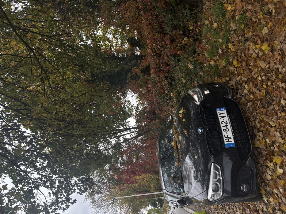 A black BMW vehicle, bearing French license plate HF-842-VY (Meuse department, "55"), is parked on a leaf-strewn verge adjacent to a paved street in Strasbourg, France