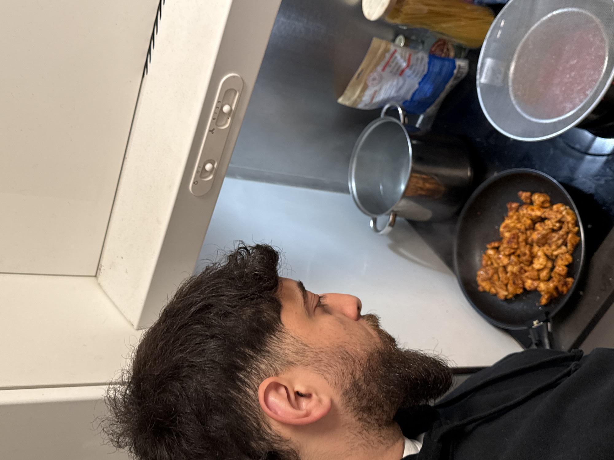 A man with dark, curly hair and a beard is standing in a kitchen