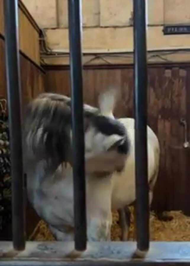 white horse with a grey mane standing in a stable. The horse is seen through the bars of its stall, turning its head to look towards the camera. There is hay on the floor of the stable, and the walls are wooden with the name "PILON" displayed above the stall.