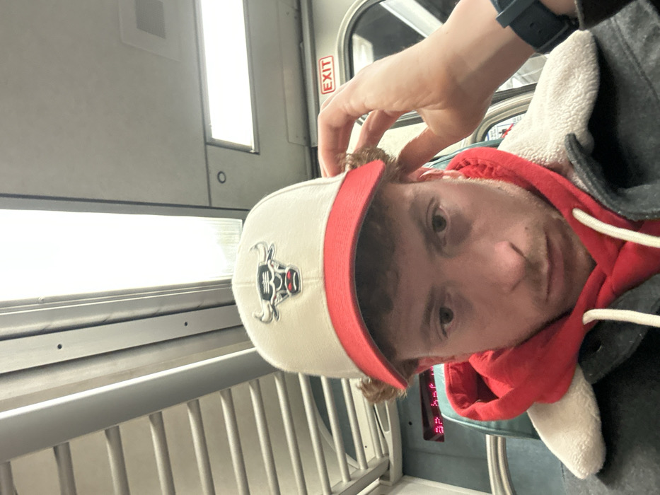 A person wearing a red hoodie, grey jacket, and Chicago Bulls baseball cap poses for a selfie on public transportation. The train's interior features bright windows and a metal safety barrier. The man's hand touches the cap's brim. The photo is slightly tilted to the side, presenting a disoriented perspective. An "EXIT" sign is visible.