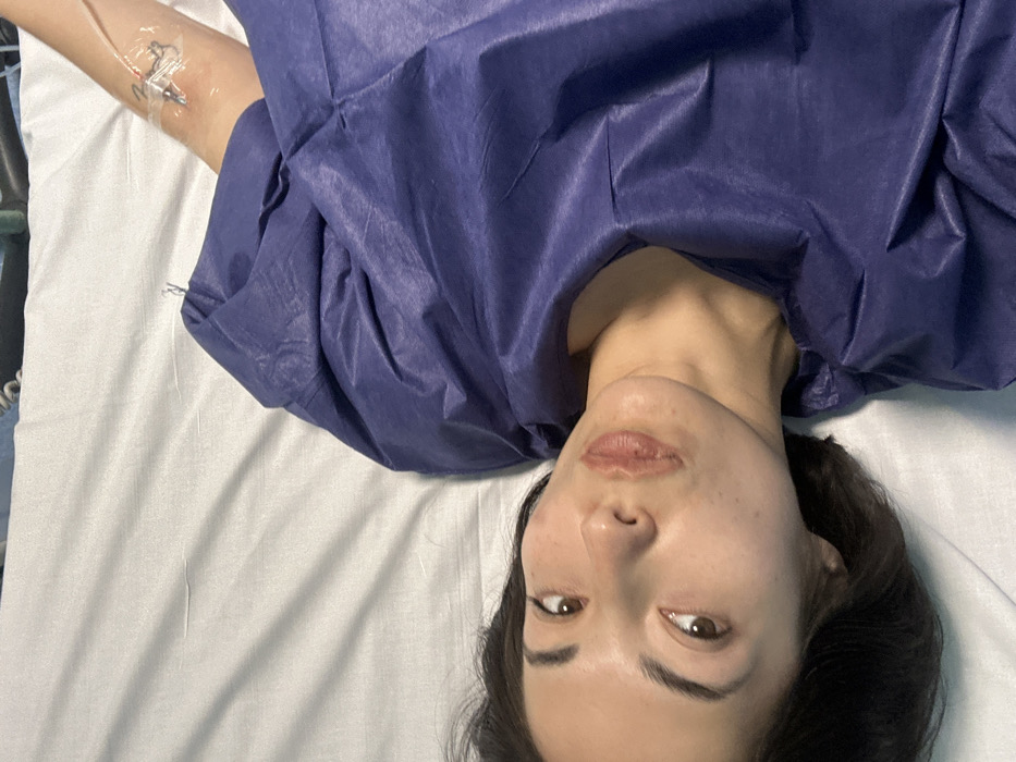 A female individual lies in a reclined position on a white medical sheet, situated in a clinical setting within the city of Nice, France. She is wearing a dark blue, disposable medical gown. Her dark hair rests on the white sheet to the left. Her gaze is directed straight ahead, towards the camera. A noticeable swelling and a lesion or scab are visible on her lower lip, with possible involvement of the upper lip. An intravenous cannula is inserted into the forearm of her left arm, secured with transparent tape, from which a clear tube extends. A small, dark tattoo is visible on the same arm, proximal to the IV insertion site. The immediate background consists primarily of the white sheet, indicating a bed or examination table.