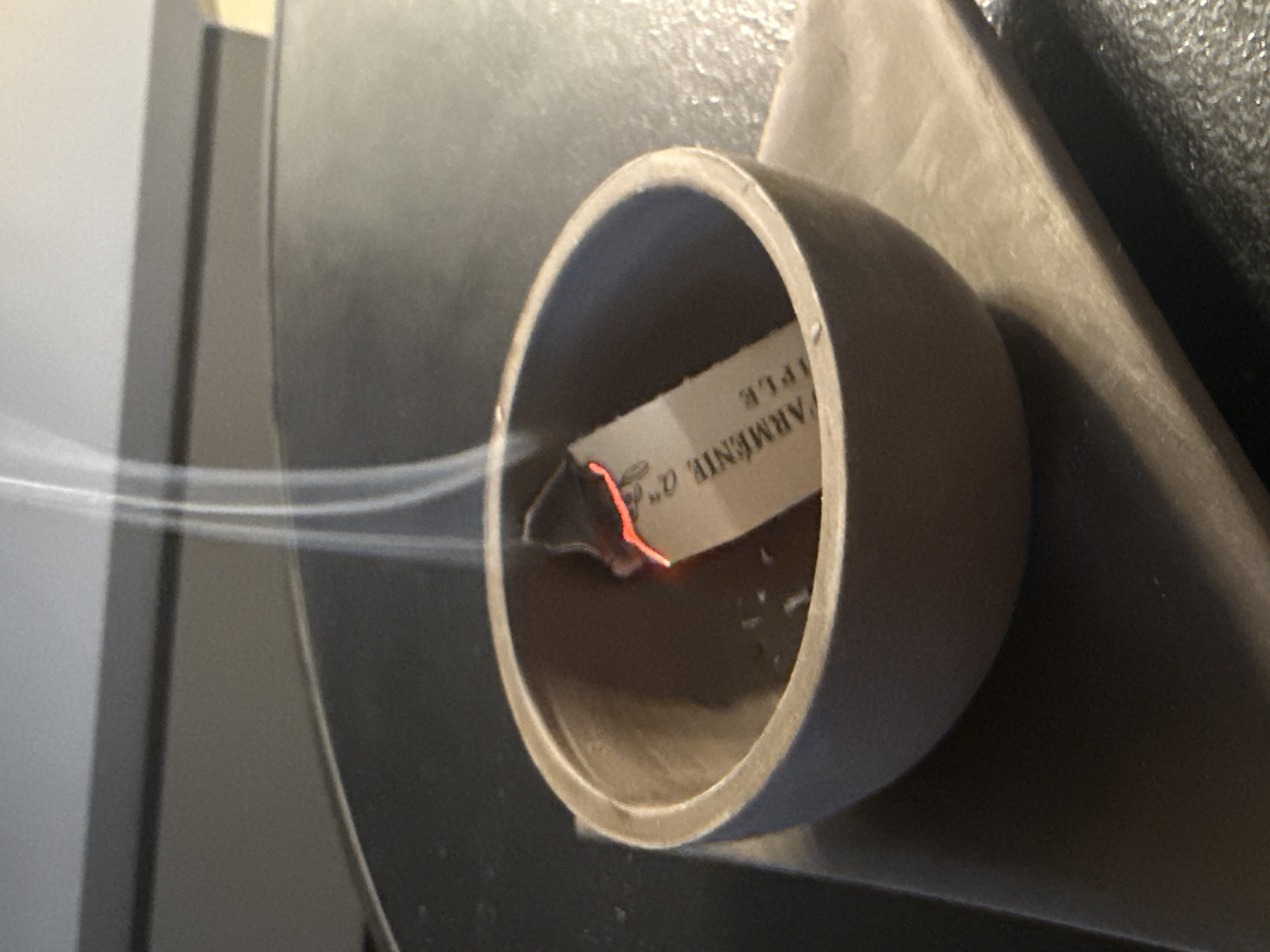 A partially-burnt piece of paper labeled "ARMÉNIE, APPLE" is in a cylindrical container