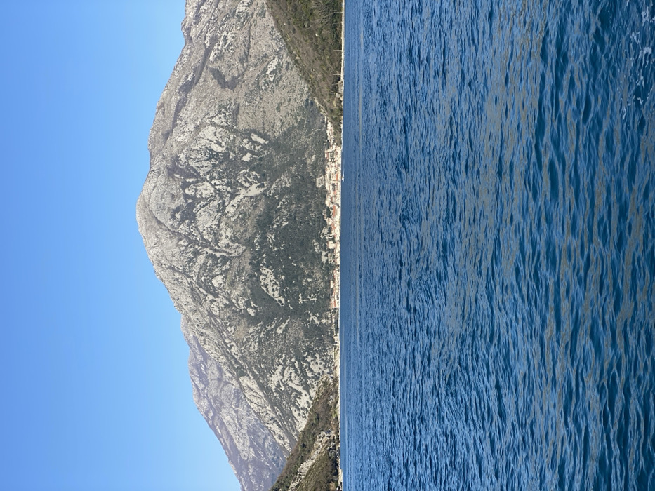 The image displays a panoramic landscape scene of the Bay of Kotor in Montenegro, with the town of Lepetane visible along the distant shoreline. The foreground is occupied by a vast expanse of deep blue water, exhibiting numerous surface ripples and small waves. In the middle ground, the town of Lepetane stretches horizontally along the water's edge at the base of towering mountains. It consists of multiple light-colored buildings, many featuring reddish roofs. A small white object, possibly a boat or buoy, is faintly discernible on the water to the right of the town. The background is dominated by a large, rugged mountain range, primarily composed of grey and light brown rock formations with scattered patches of dark green, sparse vegetation. The slopes descend towards the water on both sides of the central mountain peak. The sky above is clear and bright blue, devoid of clouds. No individuals or explicit actions are visible within the frame.