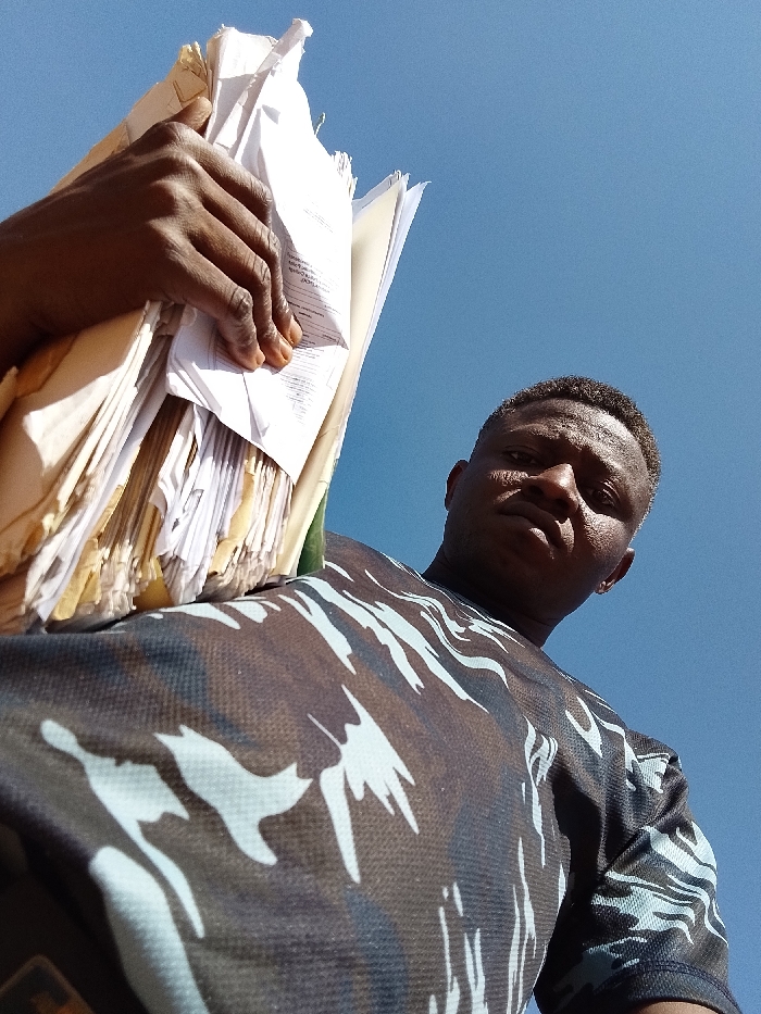 A low-angle, eye-level shot captures a male individual outdoors under a clear blue sky in Kabala, Nigeria. The subject, a male with dark skin and short, dark hair, is positioned in the lower portion of the frame, looking directly towards the camera. He is wearing a short-sleeved top with a dark background and light blue-grey camouflage-style patterns. His left hand is prominently featured in the upper-left foreground, holding a substantial stack of assorted papers and folders. The documents appear varied, some white and crisp, others aged to an off-white or yellowish hue, with visible text on some surfaces. The background consists solely of an unobstructed, bright blue sky.