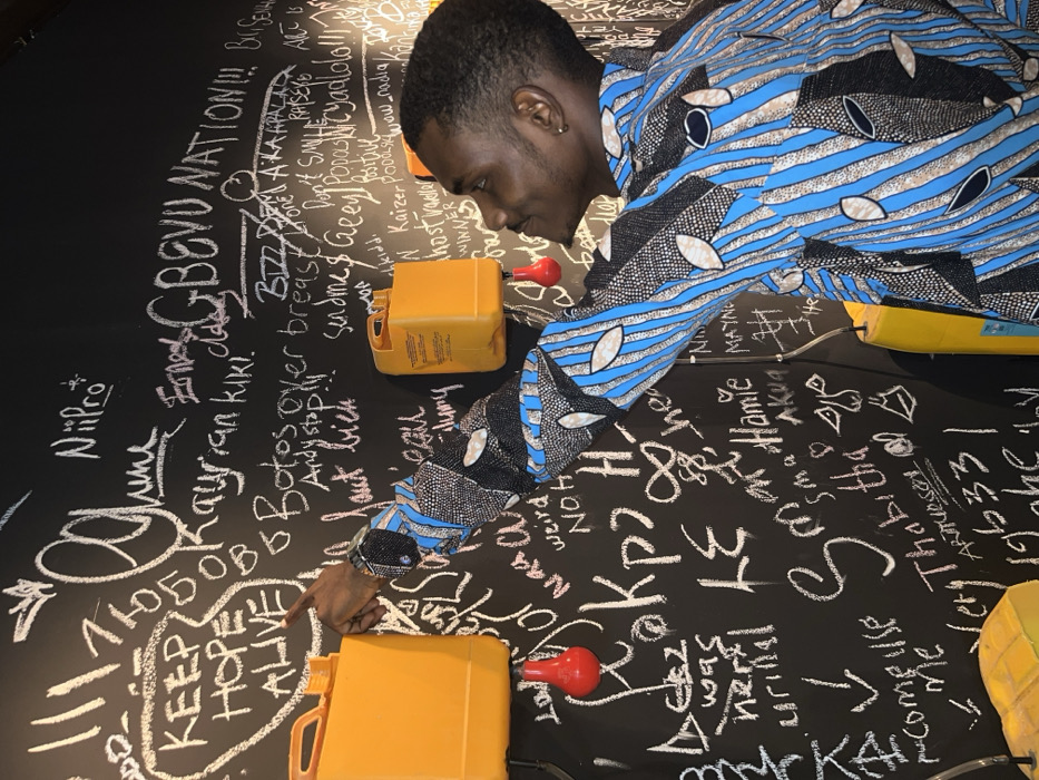 A man in a colorful shirt poses near a black wall covered with white graffiti. He points his finger at the wall where phrases like "KEEP HOPE ALIVE" and "BOVU NATION!" are written among other words. Several yellow jerrycans with red nozzles are scattered around the base of the wall. The man seems to be interacting with the wall's artwork or messages.