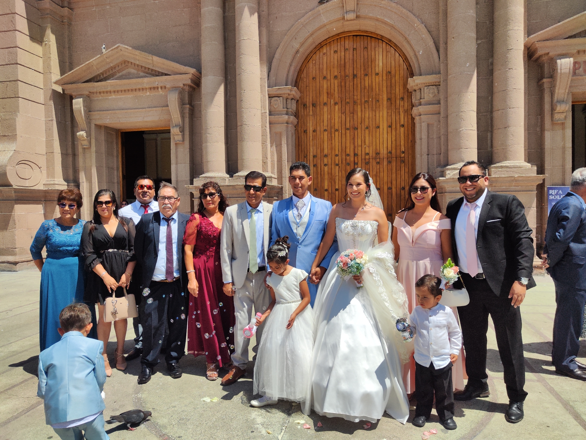 A wedding party poses outside a church in Tacna, Peru. The bride and groom stand in the center of the group, holding hands. The bride wears a white gown and veil, and holds a bouquet of flowers. The groom wears a light blue suit. To the left of the bride and groom are five adults and one child. To the right of the bride and groom are two adults and one child. A child in a blue suit feeds a bird. There are bubbles, possibly from a bubble machine, around the legs of the people. Rose petals are scattered on the ground. The church has a large wooden door and stone columns. A blue sign reading "RIFA SOLID." is partially visible to the right. The time of day is daytime.