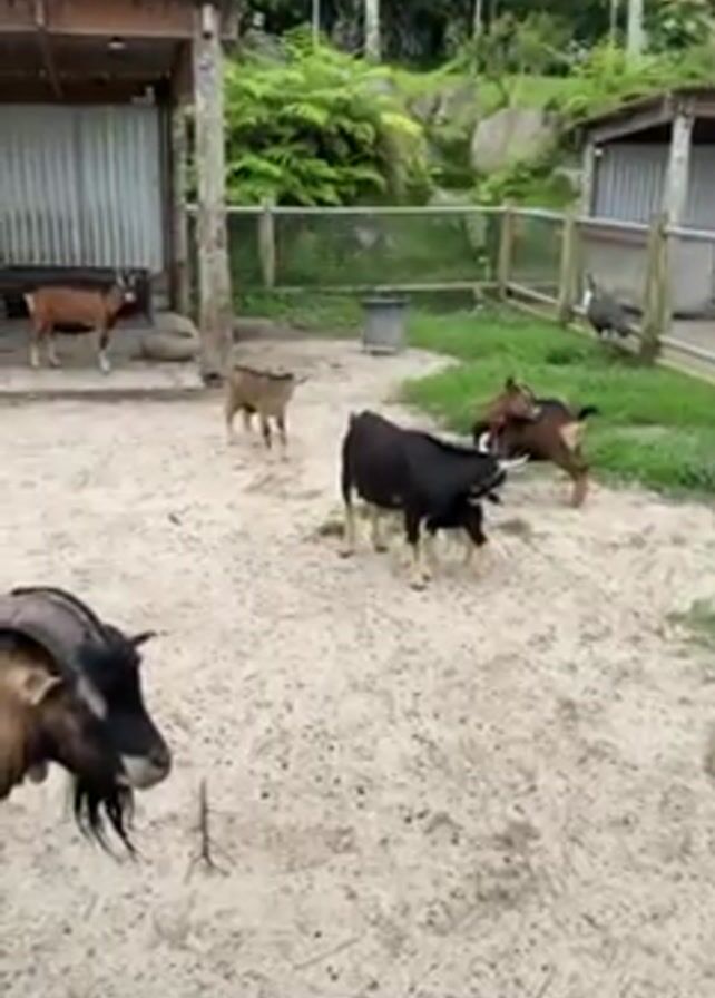 The video captures a goat enclosure featuring multiple goats of varying colors, including black, brown, and a mix of both