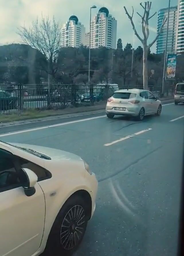 street scene with several cars driving on a multi-lane road. A white Fiat sedan is prominently featured in the foreground. In the background, there are modern high-rise buildings, a park-like area with trees, and streetlights. The weather appears overcast. The camera is positioned inside a vehicle, looking out the side window.