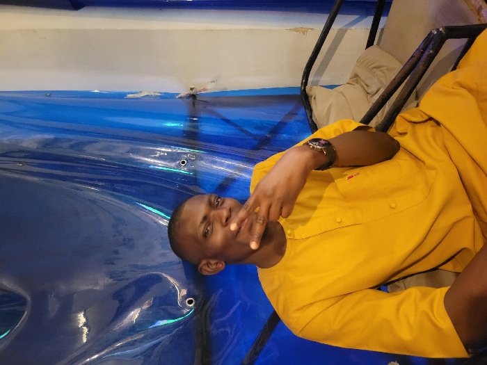 The image displays one adult male seated indoors, smiling and looking directly at the camera. He performs a V-sign with his right hand, fingers extended upwards. He wears a mustard yellow short-sleeved tunic with a mandarin collar and a dark wristwatch on his left wrist. He is situated in a dark-framed chair with a light-colored cushion partially visible. The background consists primarily of draped, translucent blue plastic sheeting featuring visible grommets, with a lighter, possibly textured or worn, wall section present on the right side of the frame. The specific location within the city of Jos, Nigeria, is not discernible from the visual information provided.