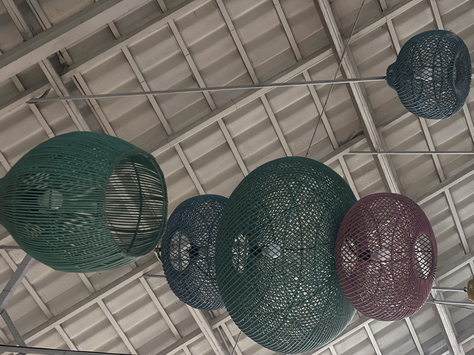 A low-angle shot showcases a ceiling with white, parallel beams. Below the ceiling hang five rounded, woven light fixtures in shades of green, blue, and purple. Each fixture appears to house a lightbulb within its open weave. A metal rod runs horizontally, connecting several of the lamps. The lamps are arranged in a slightly staggered fashion, creating a sense of depth against the structured ceiling.