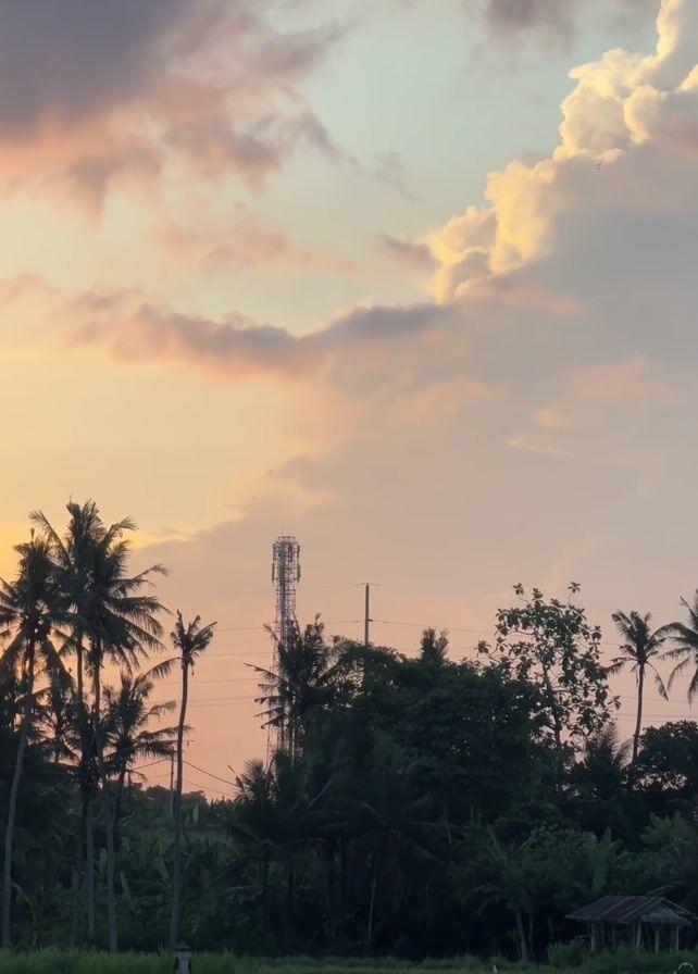 tropical landscape at sunset. In the foreground, there's a green rice field with a few white birds clustered near the edge. Behind the field, there is a row of tall palm trees silhouetted against the vibrant orange and pink sky, where the sun is beginning to set. A telecommunications tower is visible among the trees on the right side of the frame. The sky contains a mix of dark, grey clouds and some bright, illuminated clouds in the distance. A distant figure can be seen walking in the field. An audio track includes the sound of a passing vehicle.