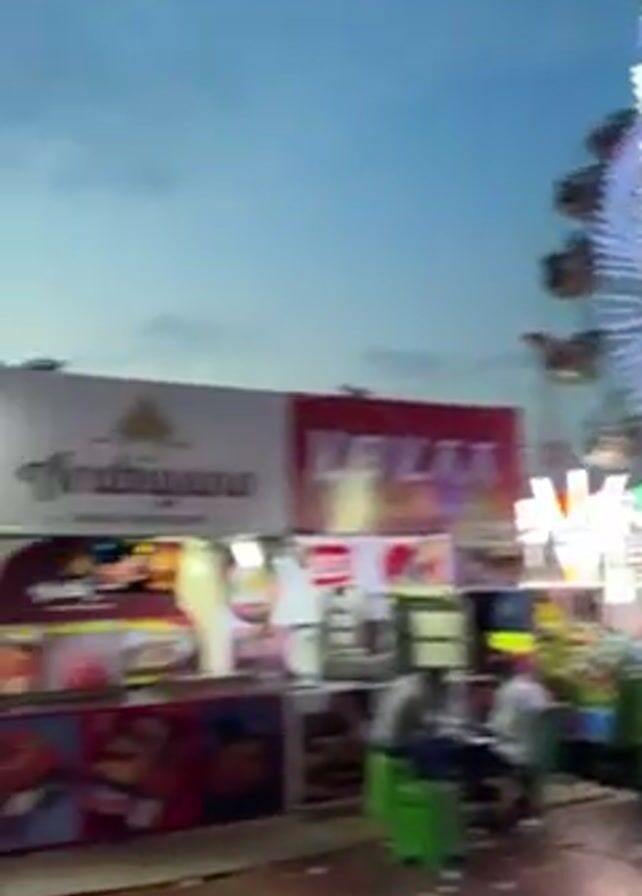 lively outdoor event with a large Ferris wheel illuminated against a twilight sky. The event seems to be a fair or festival, with various food stalls and game booths set up. Many people are walking around, enjoying the atmosphere, with some appearing to be in groups. Stalls like "Turkish Yanı" and "Mocktail Bar" are visible, suggesting a variety of food and drink options. The general environment is festive, indicated by the bright lights and the crowd of people. The camera moves through the crowd.