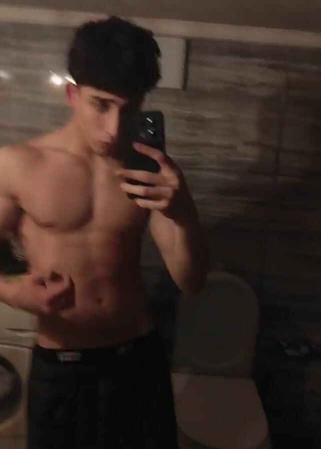 A young man with curly hair is taking a selfie in a bathroom mirror. He is shirtless and wearing dark-colored shorts with a logo waistband. The bathroom has marble-patterned walls and contains a washing machine to the left and a toilet to the right. The man flexes his arm and poses for the camera. The lighting is dim.