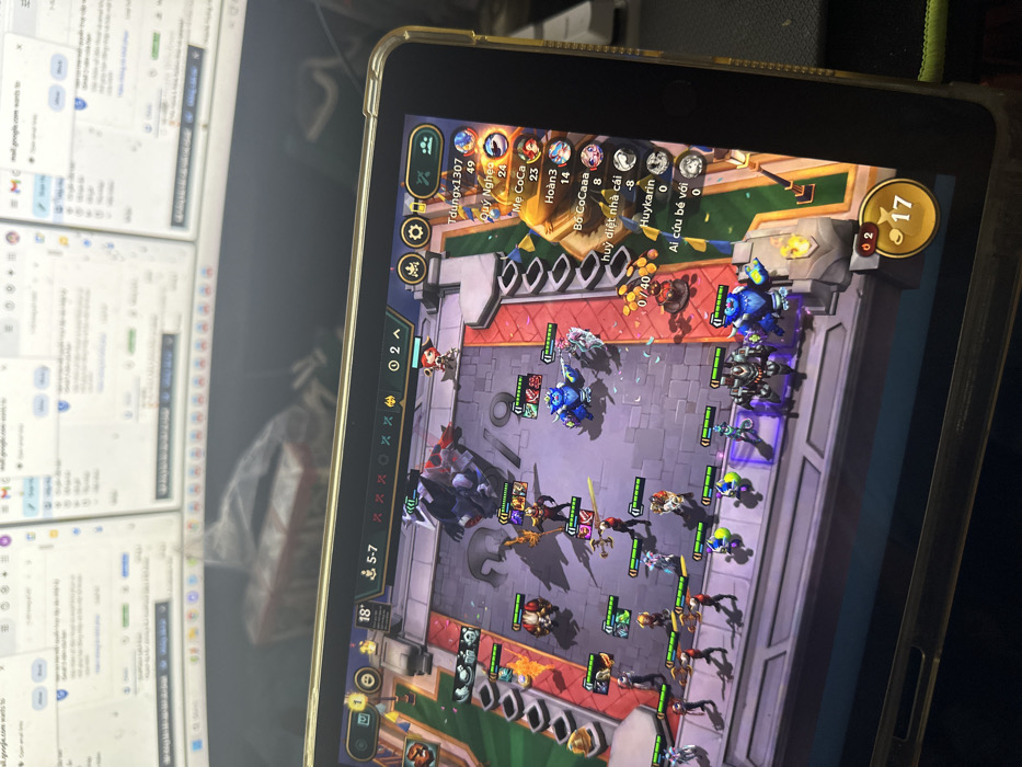 A tablet displaying a mobile game is being played. The game is set in a fantasy world, with various characters and creatures. The game is in progress with multiple players represented by different usernames. The tablet is positioned on a desk with two open laptop screens behind it. The laptops are displaying web pages from the Google website. The tablet is oriented vertically, the screen displaying a battle scene between two teams. The score is 5-7, with the score displayed in the top left corner of the screen. The tablet is a dark grey color, the screen is bright and colorful, and the screen is surrounded by a thin black bezel. The game is in progress, with multiple players and characters on the screen.