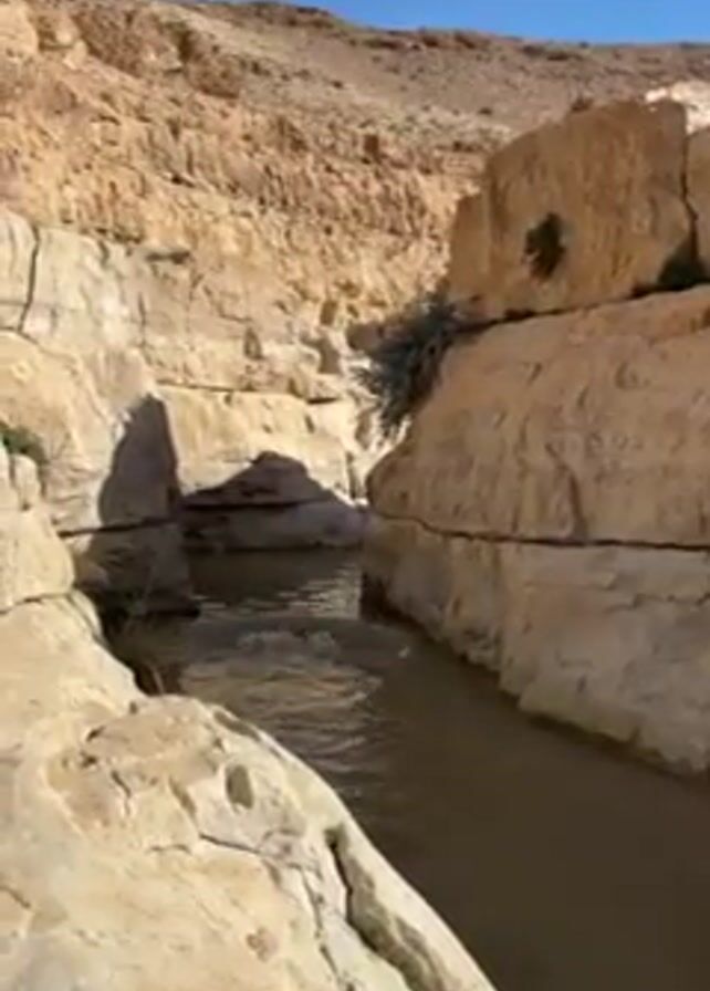The video features a man swimming in a narrow canyon filled with water. The man is of average build and appears to be enjoying the swim. The canyon walls are made of light-colored rock, possibly sandstone or limestone, and appear to be textured, with a few sparse patches of vegetation visible on the walls. The water is a murky brown or tan color, suggesting the presence of sediment or minerals. The sky is clear and blue, indicating sunny weather. The camera remains relatively still, offering a static view of the scene.