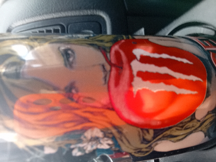 This image captures a close-up of a cylindrical container, likely an energy drink can or reusable bottle, situated within the dark interior of a vehicle in Kotel, Bulgaria. The container features a graphic design depicting an animated female figure with long, flowing light-colored hair, including a distinct orange section. Her face is partially visible, showing prominent eyes with dark makeup, while a large, glossy red apple obscures her nose and mouth. The red apple prominently displays the white, claw-mark-style Monster Energy logo. The container rests within a circular cup holder or compartment, surrounded by dark, textured plastic surfaces consistent with a car's dashboard or console. No individuals are directly visible.