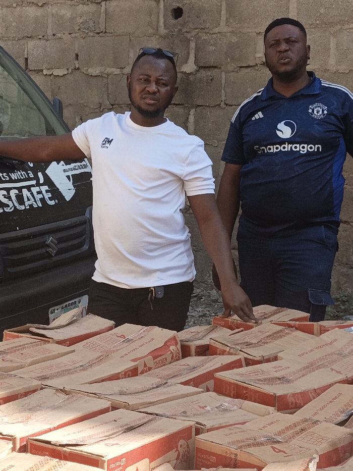 The scene depicts two adult males standing outdoors in Fagge A, Nigeria, positioned behind a large collection of packaged goods. A light-colored, unrendered brick wall forms the background. The male on the left, with dark hair and a beard, wears sunglasses on his head, a white short-sleeved t-shirt with a "BM Sports" logo, and dark shorts with keys clipped to the waistband. He stands with his left arm extended to his side, looking forward. The male on the right, with dark hair and a beard, wears a dark blue short-sleeved t-shirt featuring a Manchester United crest and a "Snapdragon" logo, paired with dark blue cargo shorts. His right hand rests on the top of a stack of boxes as he looks forward. In the immediate foreground and extending between the men are numerous light brown cardboard boxes with red printing. Visible text includes "CHICKEN" and "20x50g," along with a chicken icon, indicating food products. The boxes are stacked in multiple layers. A dark-colored vehicle, likely a van or SUV, is partially visible behind the left male. It displays a "Nescafé" decal on its side, a "LAGOS" license plate, and a Suzuki grille emblem. The lighting suggests an outdoor daytime setting.