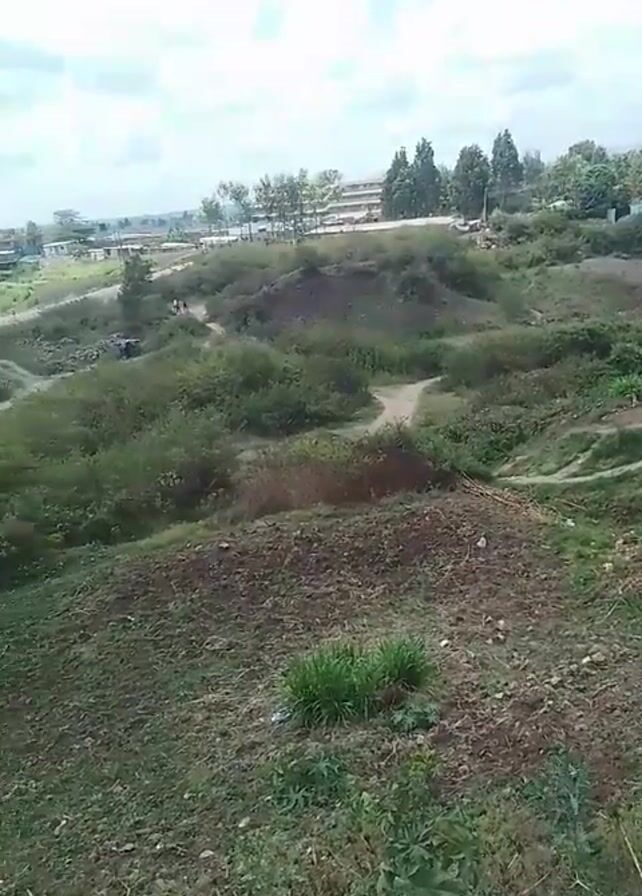 landscape with varying elevations, featuring a dirt path winding through bushy areas and dirt piles. Two people are seen walking on the path in the middle distance. In the background, there are buildings and more trees, suggesting a somewhat urban or suburban setting. A brief pan reveals a quarry. The sky is partly cloudy. The foreground consists of bare earth and sparse vegetation.