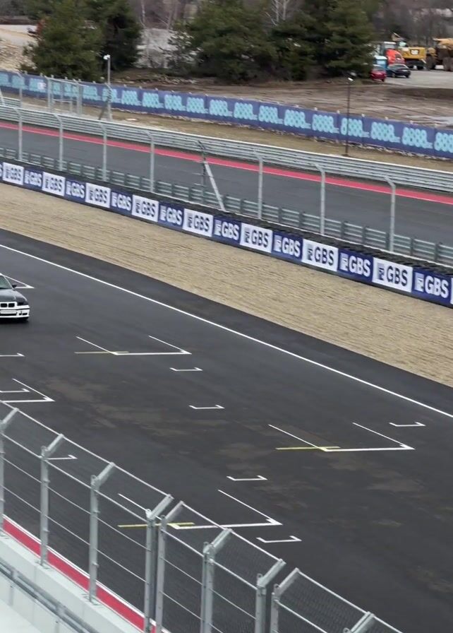 A white and black race car with orange accents speeds along a racetrack. The camera pans to follow the car as it moves from left to right on the screen. The track is surrounded by metal fencing and banners with logos, including "GBS", "UniCredit Bulbank", and "A1 motor park". Beyond the track, there are trees, buildings, and hills under a cloudy sky. There is no visible people in the scene.