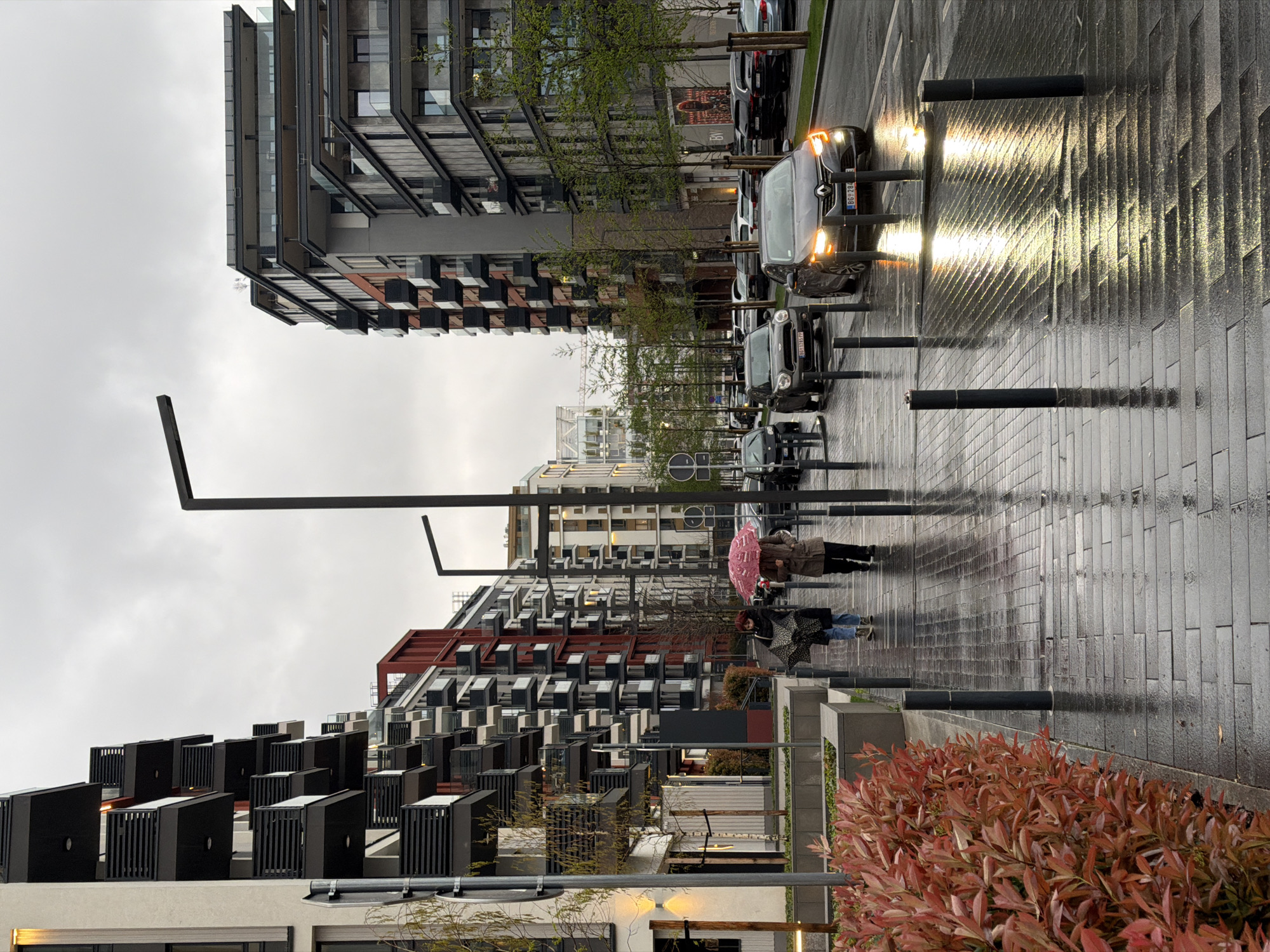 The image captures a street scene in Belgrade, Serbia, on a wet, overcast day. The street is paved with dark gray rectangular tiles that reflect the ambient light and car headlights, creating a glistening effect. The streetscape is framed by modern architectural buildings, with varying heights and designs. Some buildings feature dark, box-like protrusions, possibly balconies or window bays, adding a geometric element to the scene. Several vehicles are parked along the street, including a car with illuminated headlights that stand out against the dark background. Additional vehicles can be seen further down the road. Black bollards are placed at regular intervals along the sidewalk, likely to prevent vehicles from parking on the pedestrian area. Two individuals are visible on the sidewalk. One is holding a pink umbrella, while the other is walking alongside. Both pedestrians appear to be dressed for the weather. In the foreground, a vibrant bush with reddish-brown leaves adds a touch of color to the otherwise gray and muted tones of the scene. A street lamp with a minimalist, angular design is positioned along the sidewalk, contributing to the contemporary urban aesthetic.