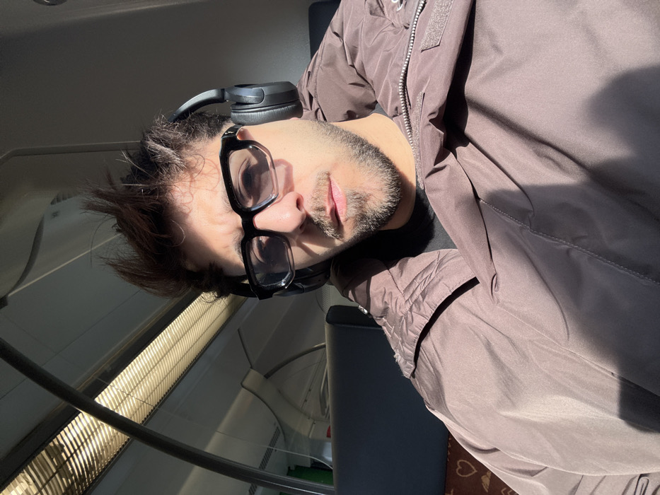 A male individual is depicted in a medium close-up, seated within a train carriage in Solingen, Germany. The subject has short, dark, spiky hair, a short beard, and is wearing black, rectangular-framed glasses with partially tinted lenses. Black over-ear headphones are worn. He is dressed in a dark inner garment and a substantial, brown/taupe puffer jacket, which is partially open at the front. The individual is looking directly towards the camera. Strong natural light enters from the left side of the frame, illuminating portions of the subject and casting distinct shadows across his face and jacket. The train interior features light-colored walls and ceiling, dark upholstered seating, and linear overhead lighting fixtures. A seat adjacent to the subject on the left exhibits a fabric pattern incorporating small heart shapes.