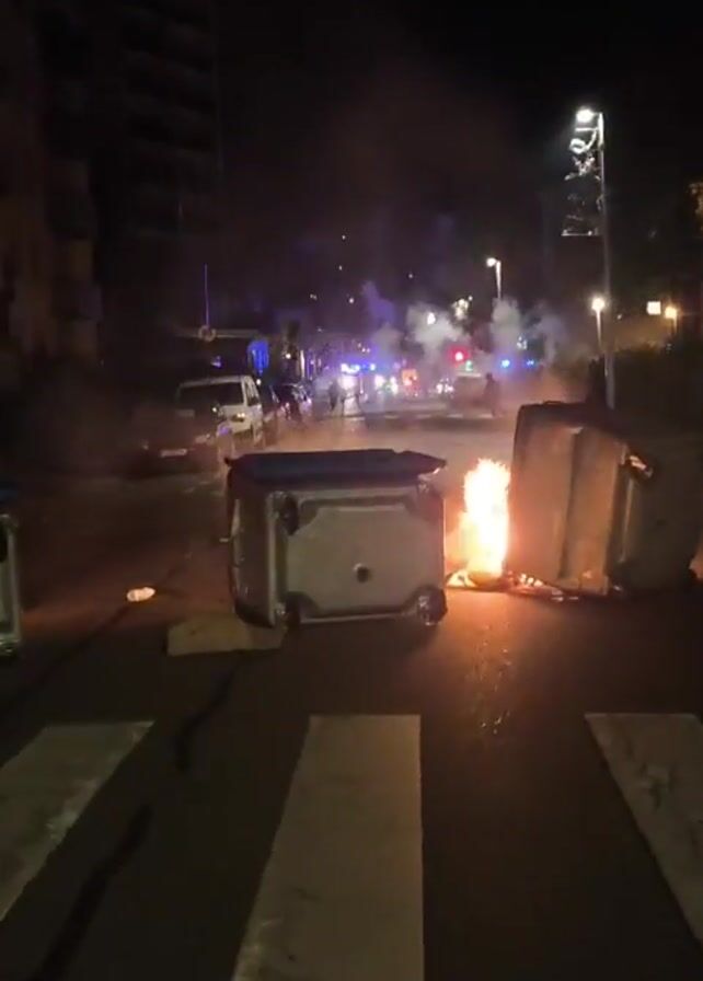 street scene at night with several turned-over trash bins on fire. In the background, there is a police presence with flashing lights and fireworks exploding in the air. There are several people on the street. The video is shot from street level near a crosswalk.